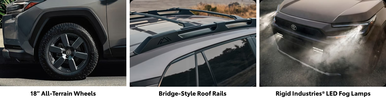 Designed with a capable, adventurous look, the RAV4 Woodland features 18” all-terrain wheels, bridge-style roof rails, Rigid Industries® LED fog lamps, rear AC power outlet, and tow hitch – so you can take advantage of any outdoor adventure.